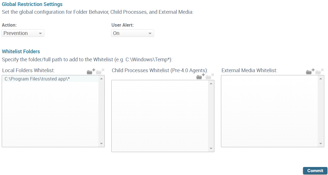 Whitelists also support wildcards and environmental variables, such as %windir% (for more details, see Wildcards and Variables in Policy Rules). - Click Commit to save your changes.