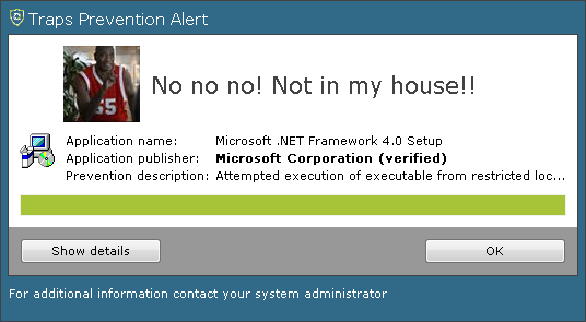 • Execution Restrictions—A user alert that Traps displays when a user opens an executable file from a location that is restricted by a restriction rule.