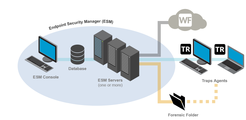 Manager (ESM), which comprises an ESM Console, a database, an ESM