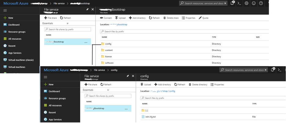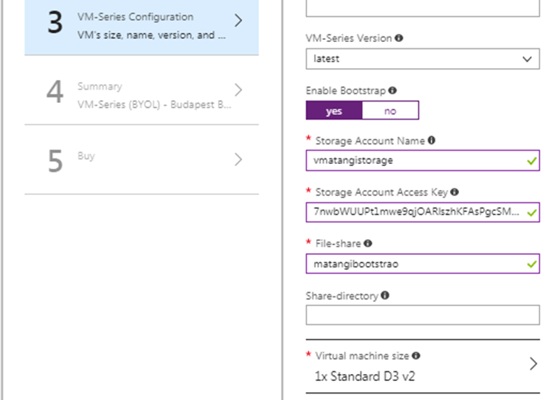 - To add a basic configuration to the bootstrap package, continue to Step 2.To manage the bootstrap package for the VM-Series firewall on Azure, you must be familiar with storage accounts on Azure and know how to create a file share and directory objects that contain the folder structure required for the bootstrap package. You can share an Azure file share across many virtual machines so that all firewalls deployed in the same region as the storage account that hosts the file share can access the files concurrently.The management interface of the VM-Series firewall must be able to access the file share that holds the bootstrap package so that it can complete bootstrapping.