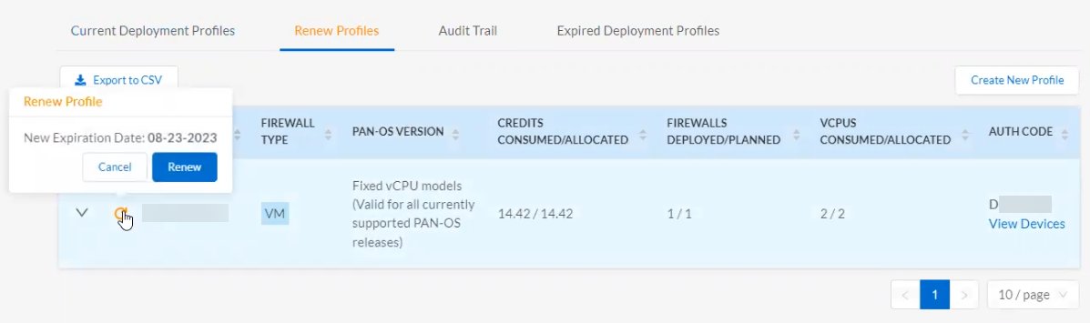 - Confirm that the renewed deployment profile is displayed.Additionally, you can return to the Software NGFW dashboard to view your credit pool. After a successful renewal, the credit pool displays Renewal Confirmed. This message remains until the end of the expiry date of your renewed Software NGFW credits.