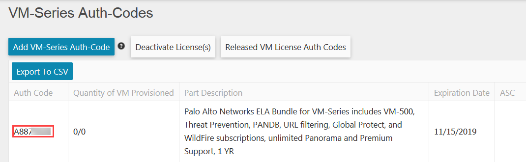 code.Do not use the ELA authorization code to activate individual VM-Series firewalls. After registering your ELA, use the VM-Series model authorization codes to activate individual firewalls. You can find these authorization codes on the Customer Support Portal under AssetsVM-Series Auth-Codes.