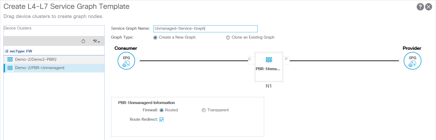 Create a service graph template that uses the device cluster representing the firewall in a policy-based redirect integration. After creating the service graph, you must apply it to EPGs to protect traffic. A contract and contract filter rules define the traffic that can be forwarded to the firewall.