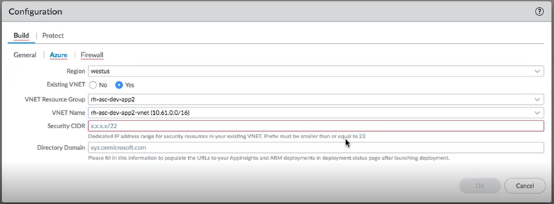If you selectYes the plugin asks for the VNET Resource Group, the VNET Name, the Security CIDR, and the Directory Domain.- VNET Resource Group—Choose from a list of all resource groups in your selected region.