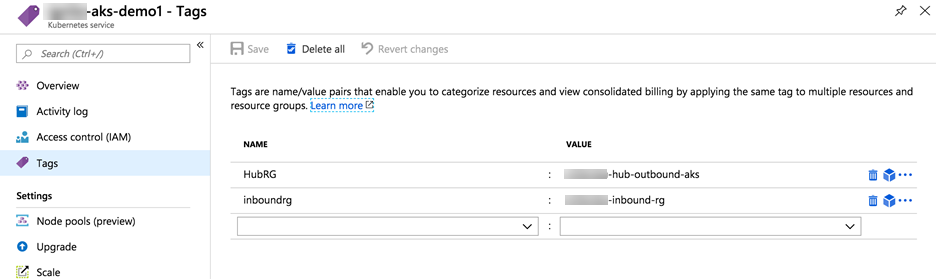 The template takes the name of the Spoke resource group as a parameter, and tags the VNet and AKS cluster with the Spoke resource group name so that it can be discovered by the Panorama plugin for Azure.