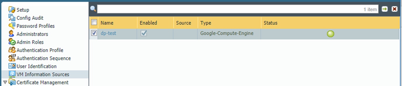 - Verify the connection status.If the connection status is pending or disconnected, verify that the source is operational and that the firewall is able to access the source. If you use a port other than the Management (MGT) port for communicating with the monitored source, then you must change the service route (select DeviceSetupServices, click Service Route Configuration, and modify the Source Interface for the VM Monitor service).