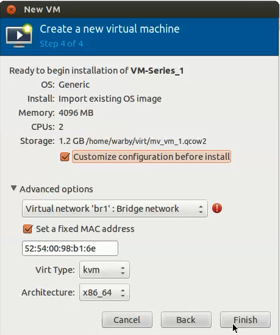 - (Optional) Bootstrap the VM-Series firewallIf you are using bootstrapping to perform the configuration of your VM-Series firewall on KVM, refer to Bootstrap the VM-Series Firewall on KVM. For more information about bootstrapping, see Bootstrap the VM-Series Firewall.