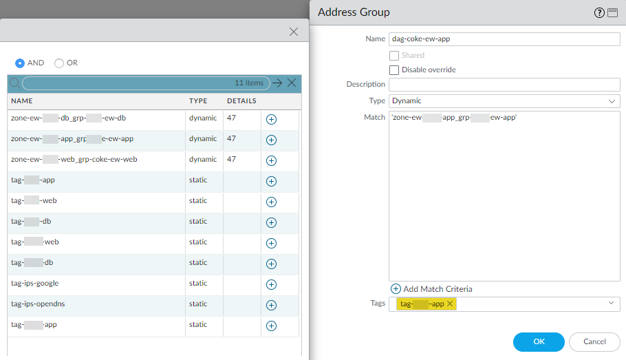 - Add Match Criteria to your dynamic address group.Some browser extensions may block API calls between Panorama and NSX-T which prevents Panorama from receiving match criteria. If Panorama displays no match criteria and you are using browser extensions, disable the extensions and Synchronize Dynamic Objects to populate the tags available to Panorama.