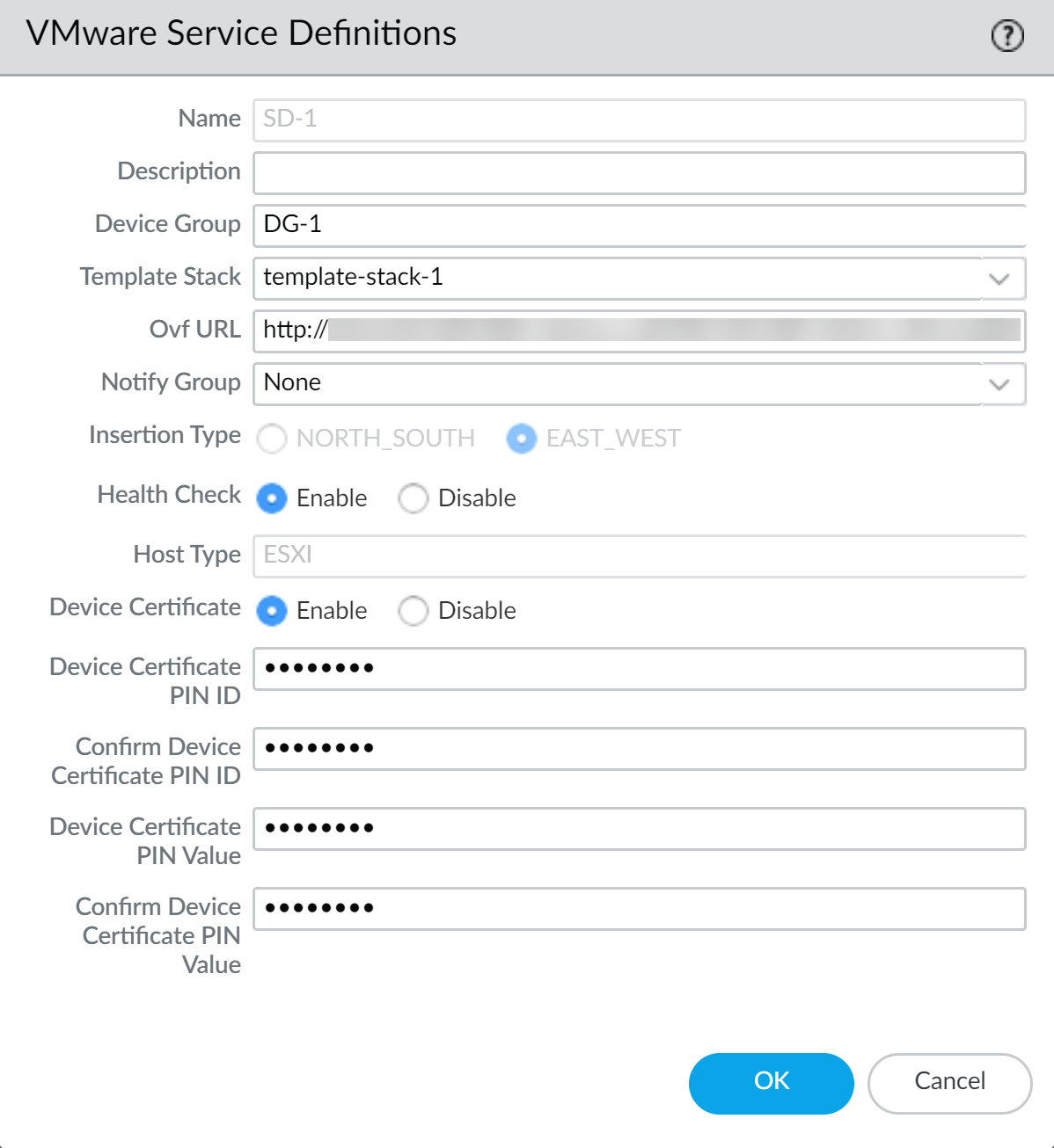 - Specify the location of the OVF file.Download the zip file, unzip it to extract and save the .ovf, mf and .vmdk files to the same directory. The ovf and vmdk files are used to deploy each instance of the firewall.Do not change the Panorama service definition OVF path after a successful NSX Service Deployment of VM-Series firewalls. Changing the OVF path, after a successful VM-Series firewall deployment, can result in a NSX Service Deployment failed state. You may resolve this failure in NSX-T Manager, however this may cause all VM-Series firewalls to redeploy.In OVF URL, add the location of the web server that hosts the ovf file. Both http and https are supported protocols.You can use the same ovf version or different versions across service definitions. Using different ovf versions across service definitions allows you to vary the PAN-OS version on the VM-Series firewalls in different ESXi clusters.
