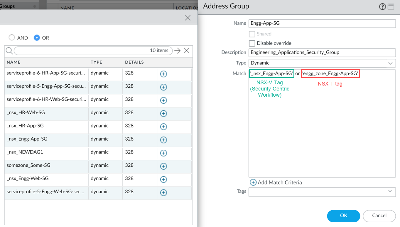 - Add the NSX-T tag to the dynamic address groups. Be sure to use the OR operator between the tags.