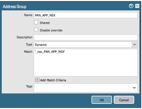 - Define the match criteria.For the dynamic address group to become a security group in NSX-V Manager, the match criteria string must be enclosed in single quotes with the prefix _nsx_ followed by the exact name of the Address Group. For example, ‘_nsx_PAN_APP_NSX’.