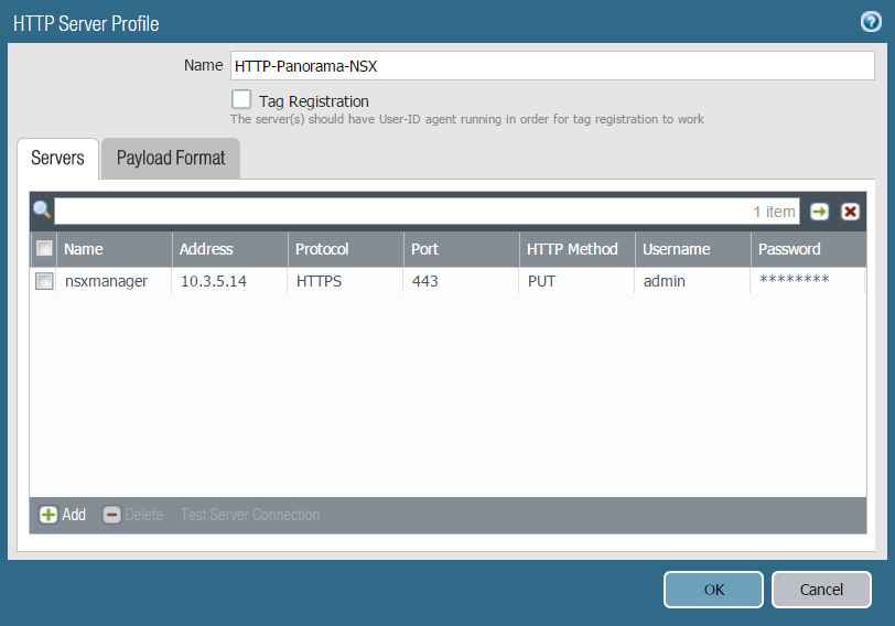 - Select PanoramaServer ProfilesHTTP and Add a new HTTP Server Profile.