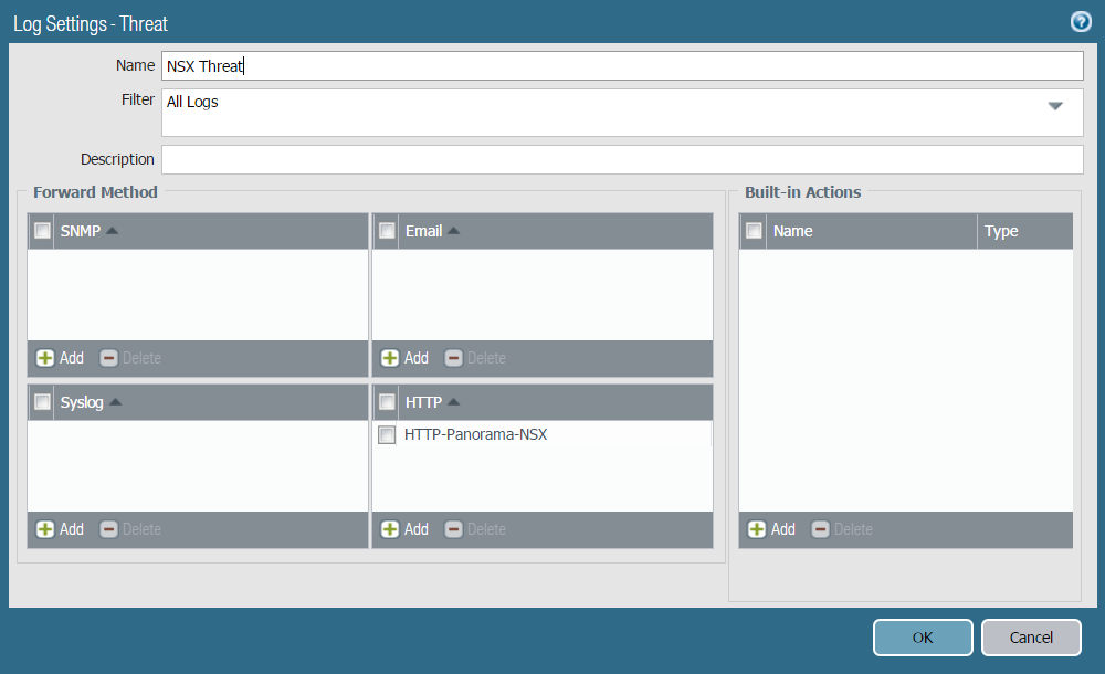 - (Optional) Under Filter, you can add filters such as severity to narrow the logs that are forwarded to NSX-V Manager. If All Logs is selected, all threat or traffic logs that meet the criteria set in the HTTP Server profile are sent to NSX-V Manager.