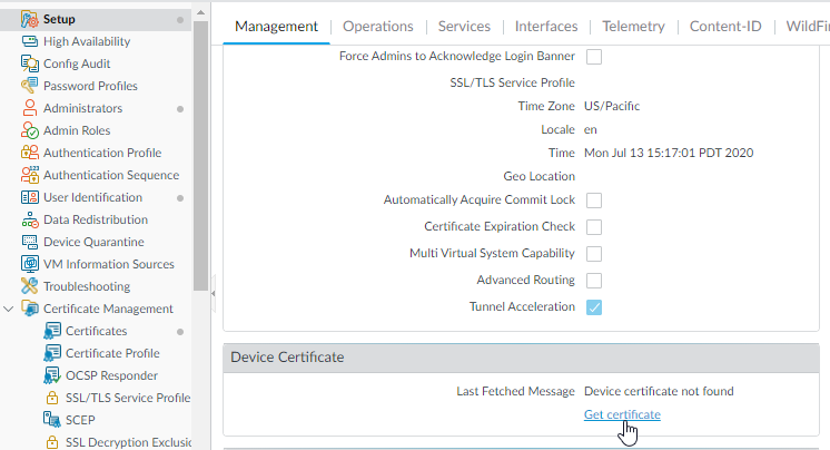 - Log in to the firewall, and retrieve the device certificate.Select SetupManagementDevice Certificate and Get Certificate