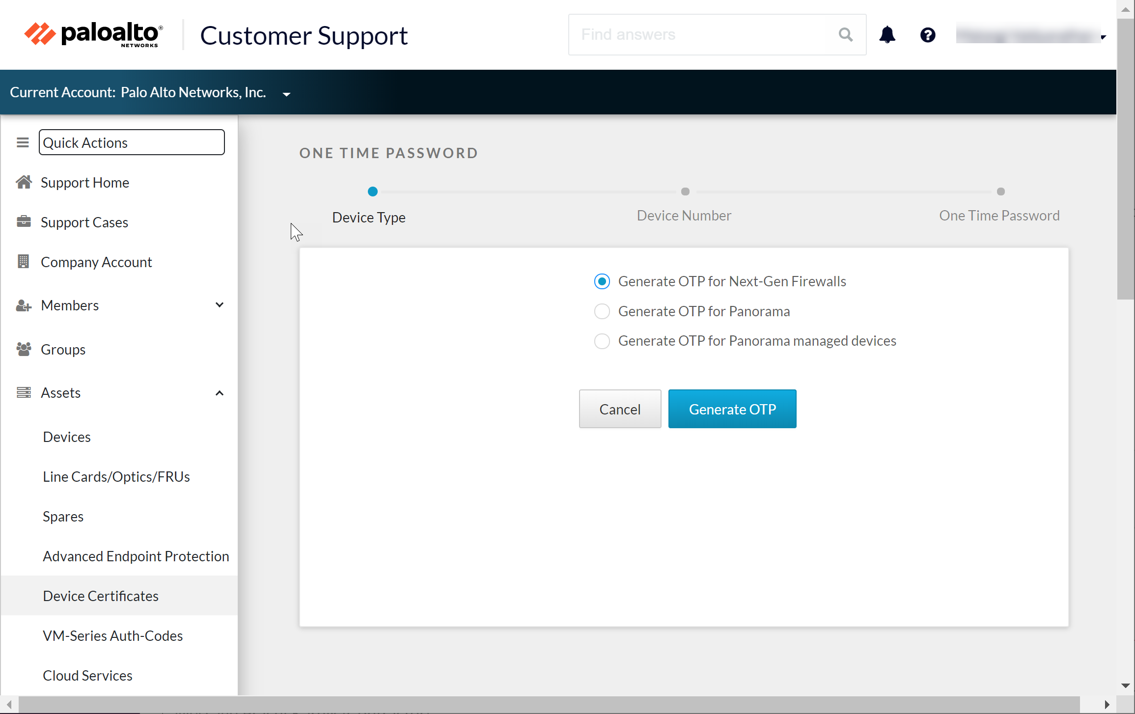 The firewall requires this device certificate to get the site license entitlements and securely access the cloud services.- Log in to the Customer Support Portal with a user role that has permission to generate an OTP.Register your VM-Series firewall, if you have not already.