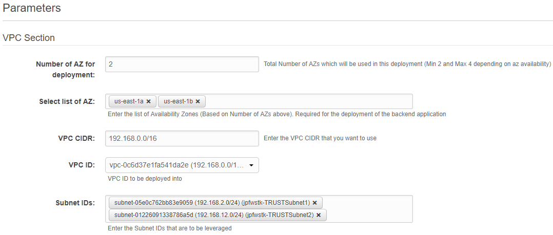 - Select the two Availability Zones that your setup will span in Select list of AZ. If you are deploying within the same VPC make sure to select the same Availability Zones that you selected for the firewall template.