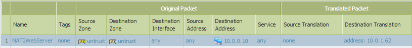 - Translated Address: 10.0.0.10 (the firewall dataplane interface in the untrust zone.)