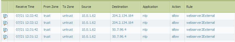 - Select PoliciesSecurity.In this example, we have four rules. A rule that allows management access to the firewall traffic, a rule to allow inbound traffic to the web server, a third rule to allow internet access to the web server, and in the last rule we modify a predefined intrazone-default rule to log all traffic that is denied.