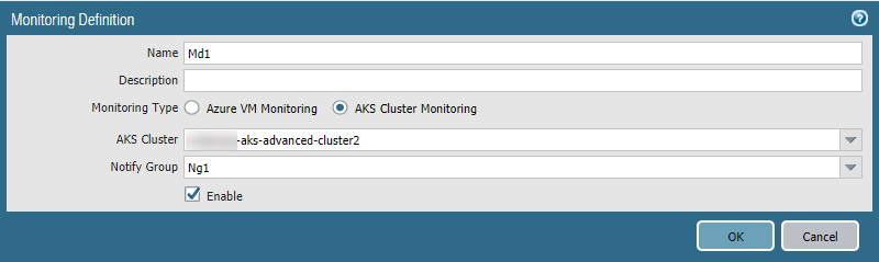 - View secured AKS services.In PanoramaAzureDeployments, view your monitoring definition, and in the Action column select the Protected Applications and Services link.The Protected? column summarizes the security status of your resource groups. It might take several minutes for the window to populate. If you have many resource groups, enter a string in the search box to filter the output.This output is based on the Azure resource group configuration; it does not query the device group or template stack membership.