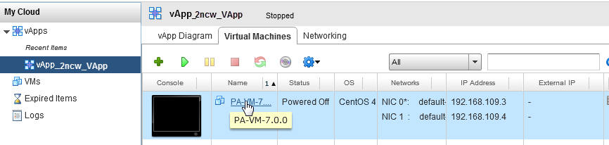 3. Select My CloudvApps and click the Name of the vApp in which to include the VM-Series firewall.