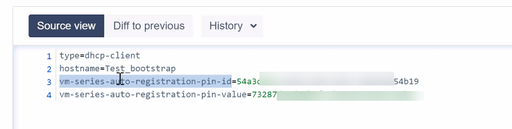 Add the registration PIN ID and value in the init-cfg.txt file.In addition to the required parameters, you must include:vm-series-auto-registration-pin-id=vm-series-auto-registration-pin-value=