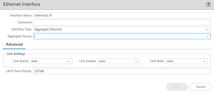 Click on the name of an Ethernet interface to configure it and add it to the aggregate group.- Select Aggregate Ethernet from the Interface Type drop-down.Select the interface you defined in the aggregate Ethernet group configuration.Click OK.Repeat this step for each other member interface of the aggregate Ethernet group.
