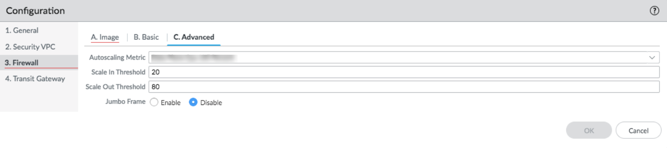 (Optional) Select FirewallAdvanced and enter the following details.- Autoscaling Metric—Choose a metric from the drop-down: Data Plane CPU Util Percent (default), Active Sessions, Data Plane Packet Buffer Util Percent, or Session Util Percent.
