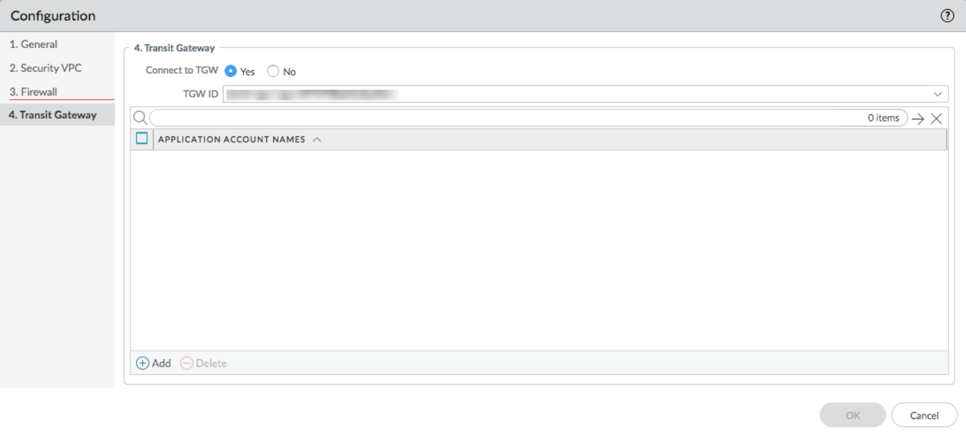 for RAM on the account you select here.If the TGW and Security VPC are in the same account, select an Application account with which you want to share the TGW. If the TGW is in an Application account, make sure that the TGW is shared on RAM.If the TGW is in an Application account (other than the Security account):