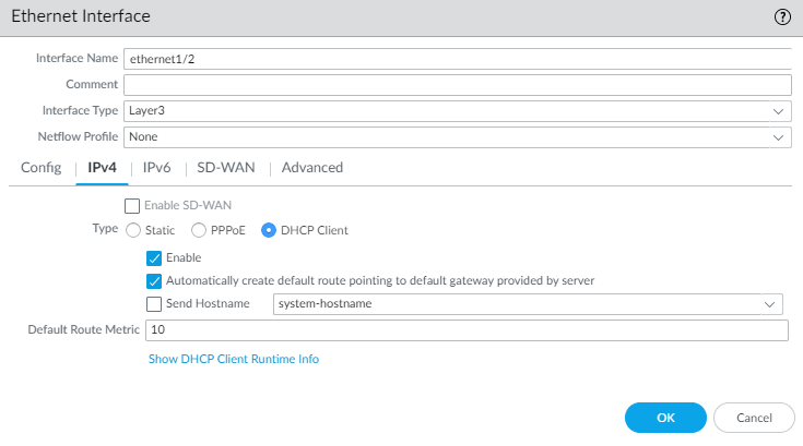 - Select NetworkInterfacesEthernet.Click on your trust interface and then the IPv4 tab.Uncheck Automatically create default route pointing to default gateway provided by server.Click OK.