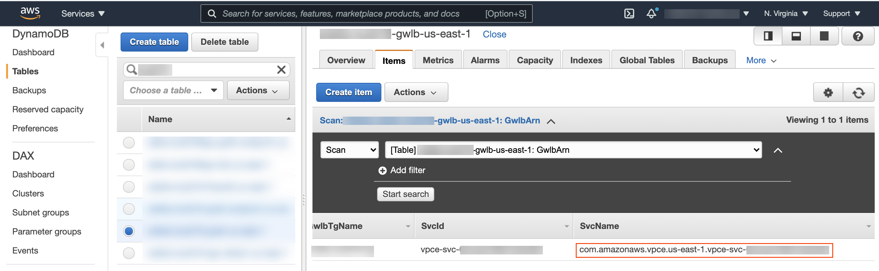 2. Select Tables and locate your security VPC table. The table name will be <stack name>-gwlb-<region>. For example—cft-deployment-gwlb-us-east-1.