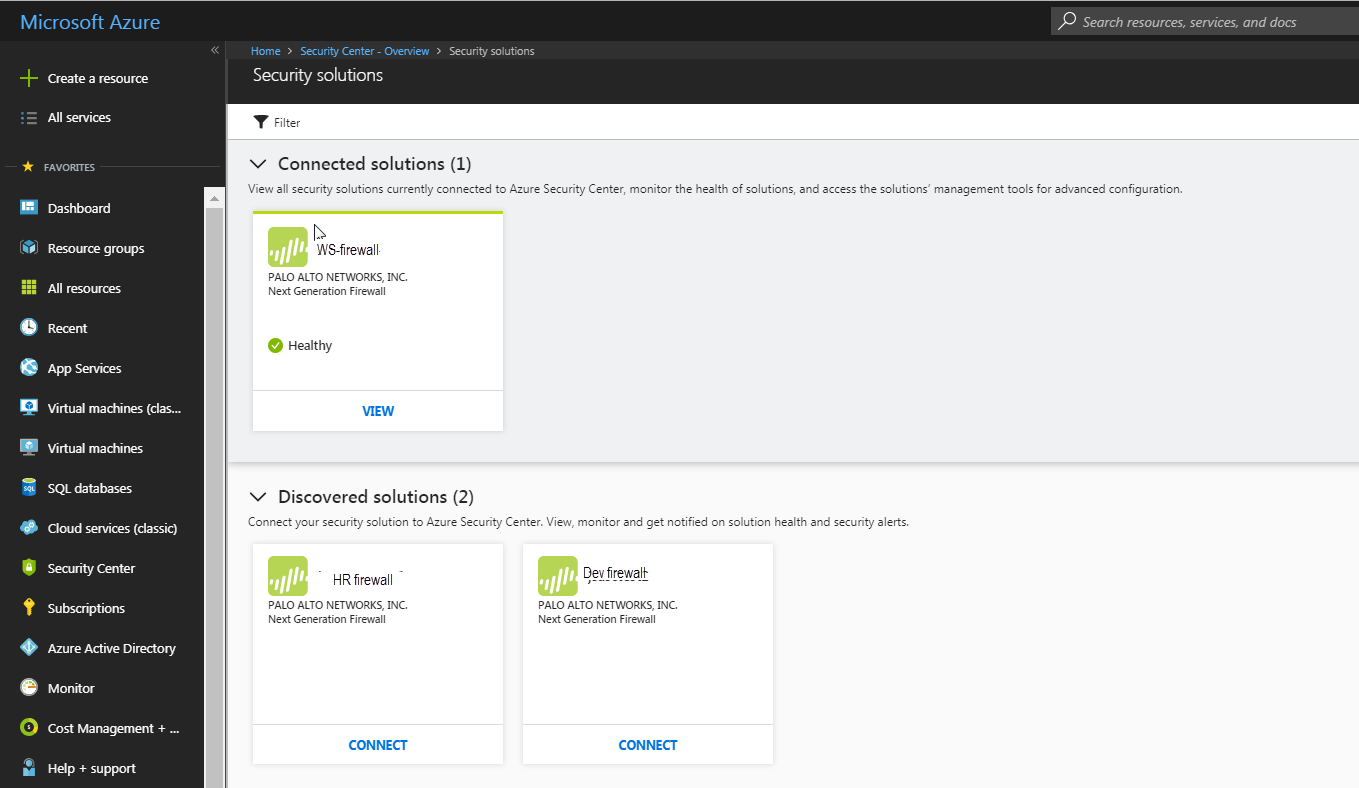 • Select a VM-Series firewall that you have already deployed for securing your workloads. If you have a Standard tier of Azure Security Center subscription, Azure Security Center discovers and displays all existing VM-Series firewalls that you have deployed either from the Azure Marketplace or using a customized deployment with Azure CLI, PowerShell or ARM template. The firewalls within your Azure subscription are grouped under Security Solutions on the Azure Security Center dashboard.