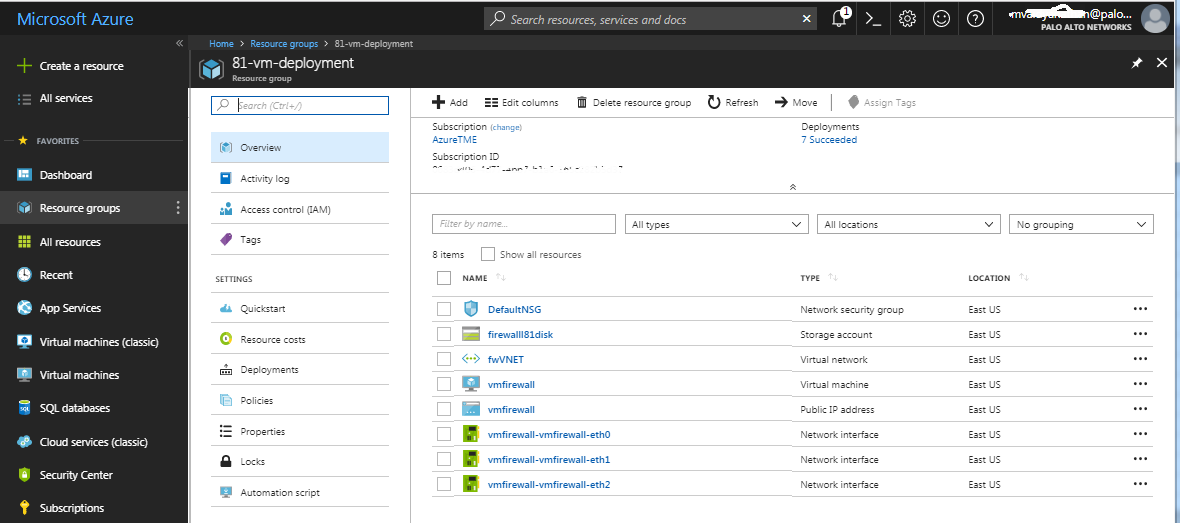 - Select your Azure Subscription.Select a resource group for holding all the resources associated with the VM-Series firewall in this deployment.You can deploy the VM-Series firewall into a new Resource Group, or an existing Resource Group that is empty. To deploy the firewall into an existing resource group that has other resources, use the ARM template in the GitHub Repository or your own custom ARM template. Ensure that the existing resources match the parameter values you provide in the ARM template.