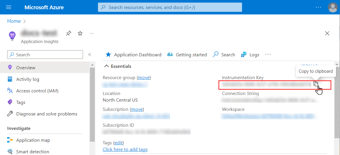 - On the Azure portal, create your Workspace-based Application Insights to monitor the firewall and copy the Instrumentation Key from ConfigureProperties.The firewall needs this key to authenticate to the Application Insights instance and publish metrics to it. See VM-Series on Azure Service Principal Permissions for the permissions required.