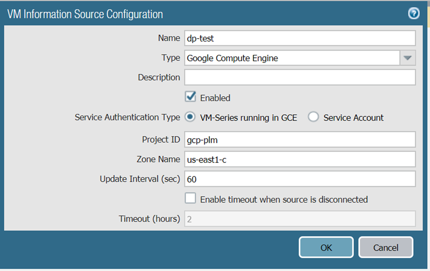 • If you choose VM-Series running in GCE, you are authenticating with the default service account generated when an instance is created. This is part of the instance metadata.