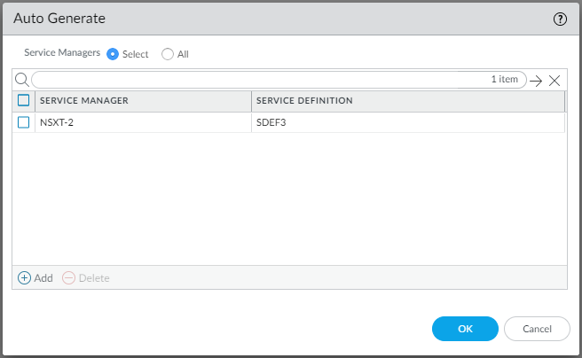 - Select PanoramaVMwareNSX-TNetwork IntrospectionPolicy.Click Auto Generate.For Service Managers, choose Select.If you select All instead of selecting specific service managers, the plugin will generate steering policy for each service definition associated with each service manager in your configuration.Click Add to select the service manager.Select a Service Manager from the drop-down.Click Add to select the service definitions.Select the service definition from the drop-down.Click OK and click OK again.