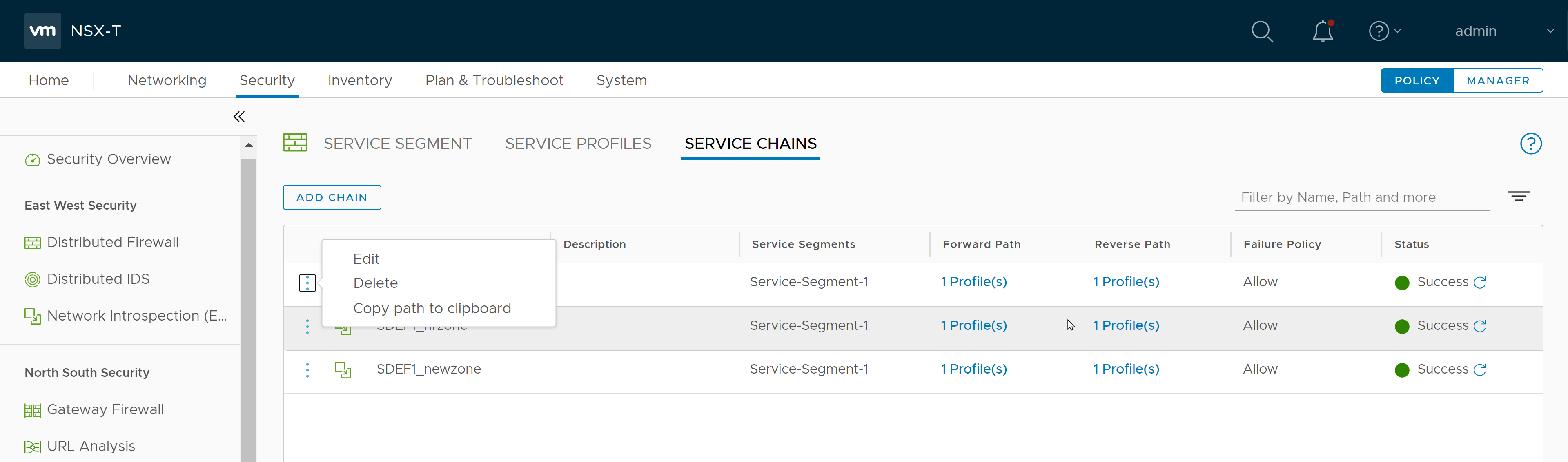 - Log in to NSX-T Manager.Select SecurityNetwork Introspection SettingsService Chains.Click the vertical ellipses.Click Delete.