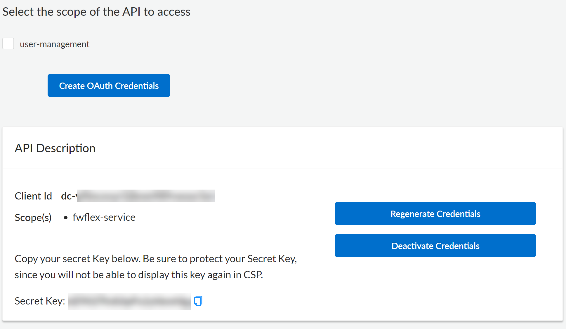 - Log in to the CSP.Select Account ManagementOAuth API Management.Select the fwflex-service scope.Click Create OAuth Credentials.