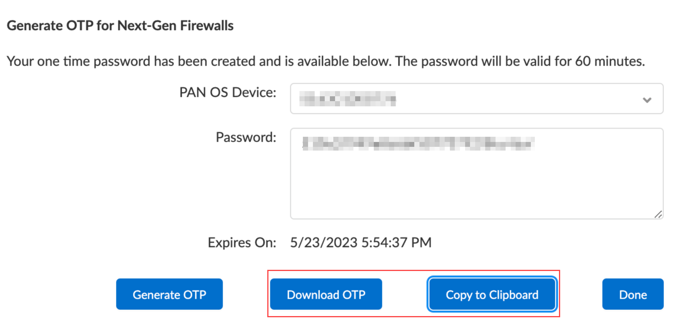 - Generate the one-time password (OTP).OTP lifetime is 60 minutes and expires if not used within the 60-minute lifetime.Firewall attempts to retrieve the OTP from the Customer Support Portal once. If the firewall fails for any reason to fetch the OTP, the OTP expires and you must generate a new OTP.