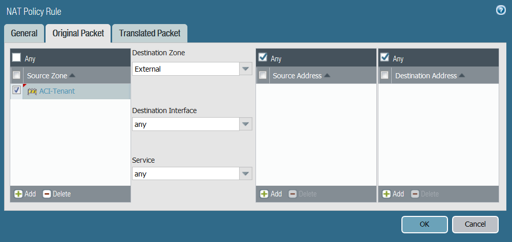 Configure address translation for outbound traffic.- Select PoliciesNAT and click Add.Enter a descriptive Name for your outbound NAT policy.Select Original Packet and click Add under Source Zone.Select the zone that matches your ACI tenant and VRF.Select the external zone from the Destination Zone drop-down.