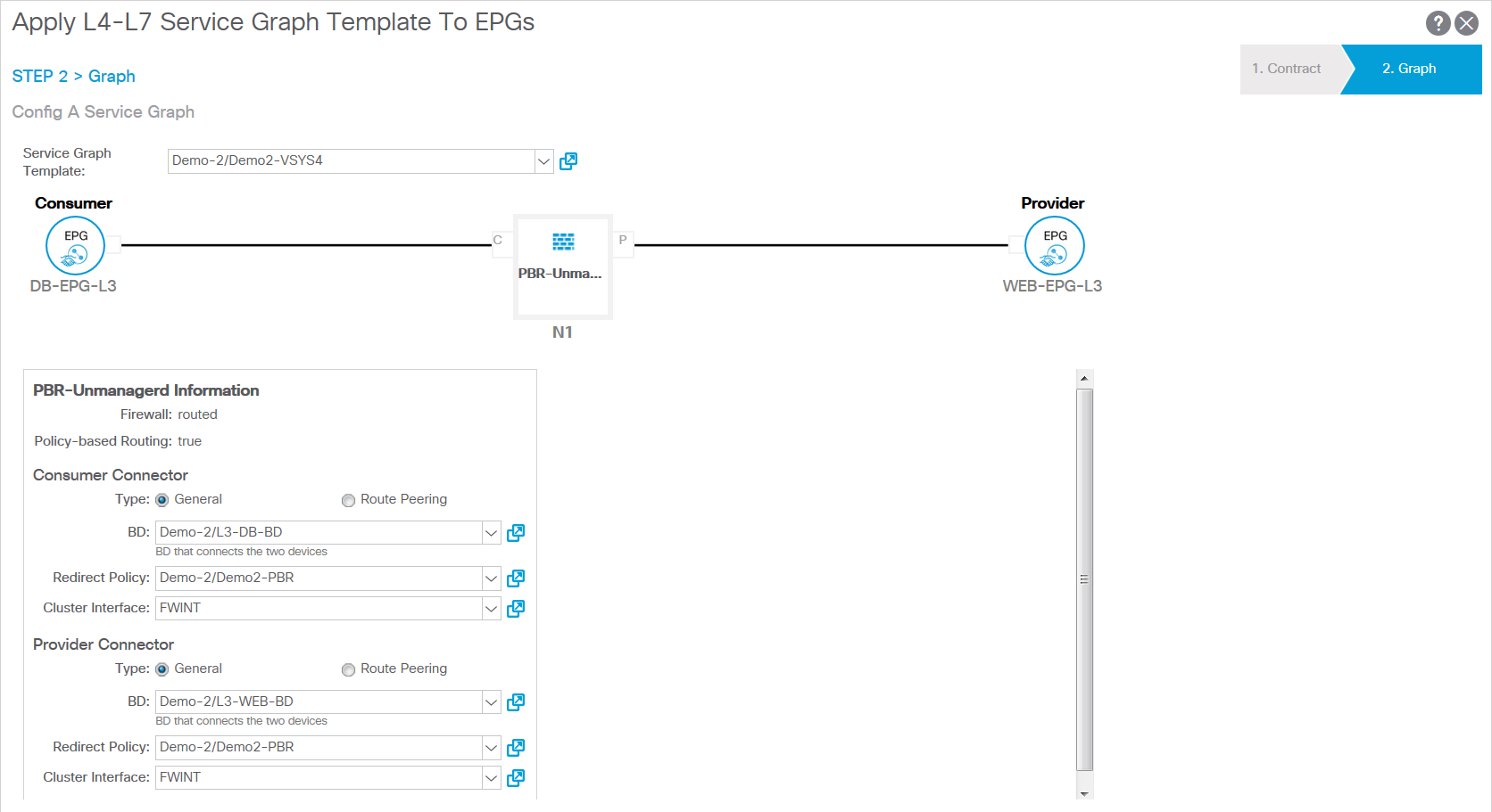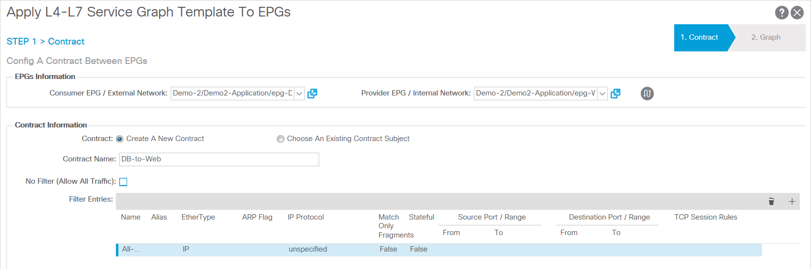 Create a service graph template that uses the device cluster representing the firewall in a policy-based redirect integration. After creating the service graph, you must apply it to EPGs to protect traffic. A contract and contract filter rules define the traffic that can be forwarded to the firewall.