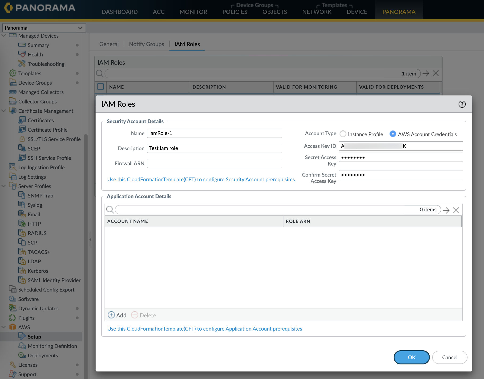 - Select Account Type—Instance Profile or AWS Account Credentials.If your Panorama is deployed on AWS, you can choose to either attach an instance profile with the correct permissions to your Panorama or add the credentials associated with the IAM role on Panorama. If your Panorama is not deployed on AWS, you must enter the credentials for the IAM role locally on Panorama.