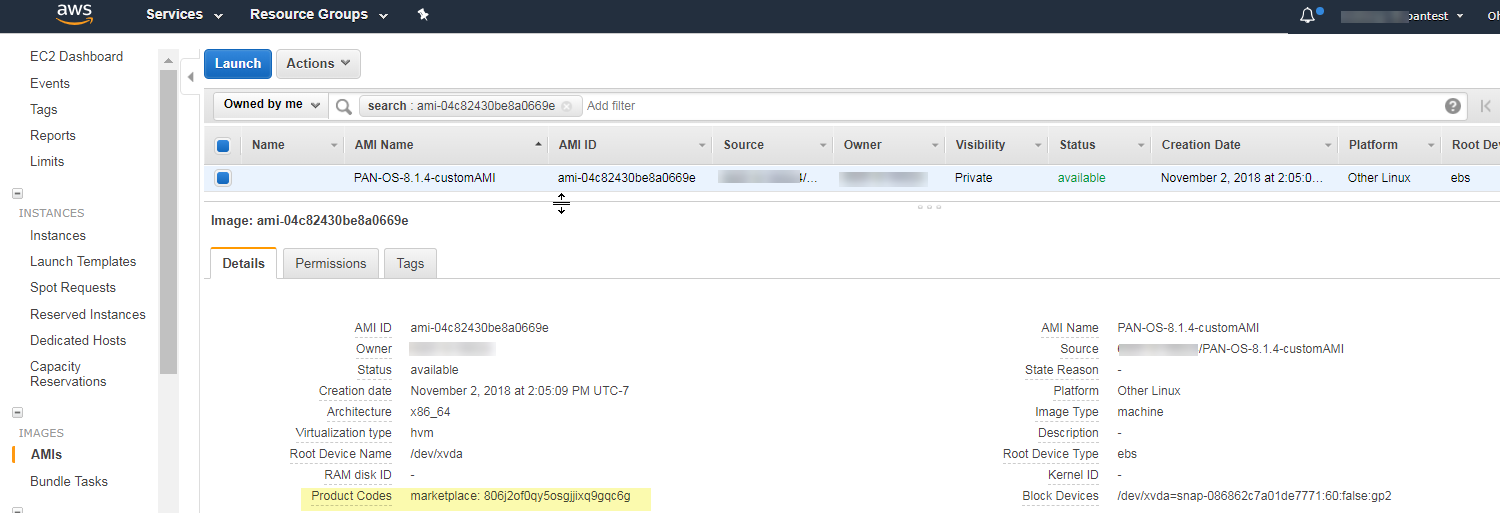 Verify that the custom AMI is created and has the correct product code.- On the EC2 Dashboard, select AMI.