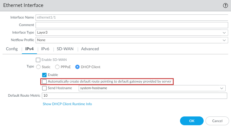 - Select NetworkInterfacesEthernet.Click on your trust interface and then the IPv4 tab.Uncheck Automatically create default route pointing to default gateway provided by server.Click OK.