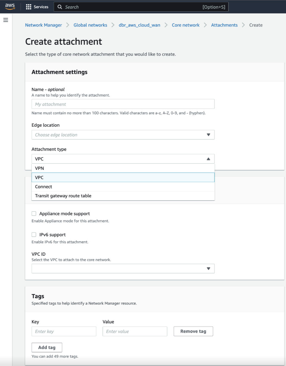 - Update VPC Route tables.Now that the necessary Cloud WAN constructs are in place, the VPCs need to be configured to facilitate packet forwarding towards the core network. The application and firewall instances or the respective VPCs need to be tagged similar to that of the segment. Add specific tags to the attachment to match one created in step 2.3.