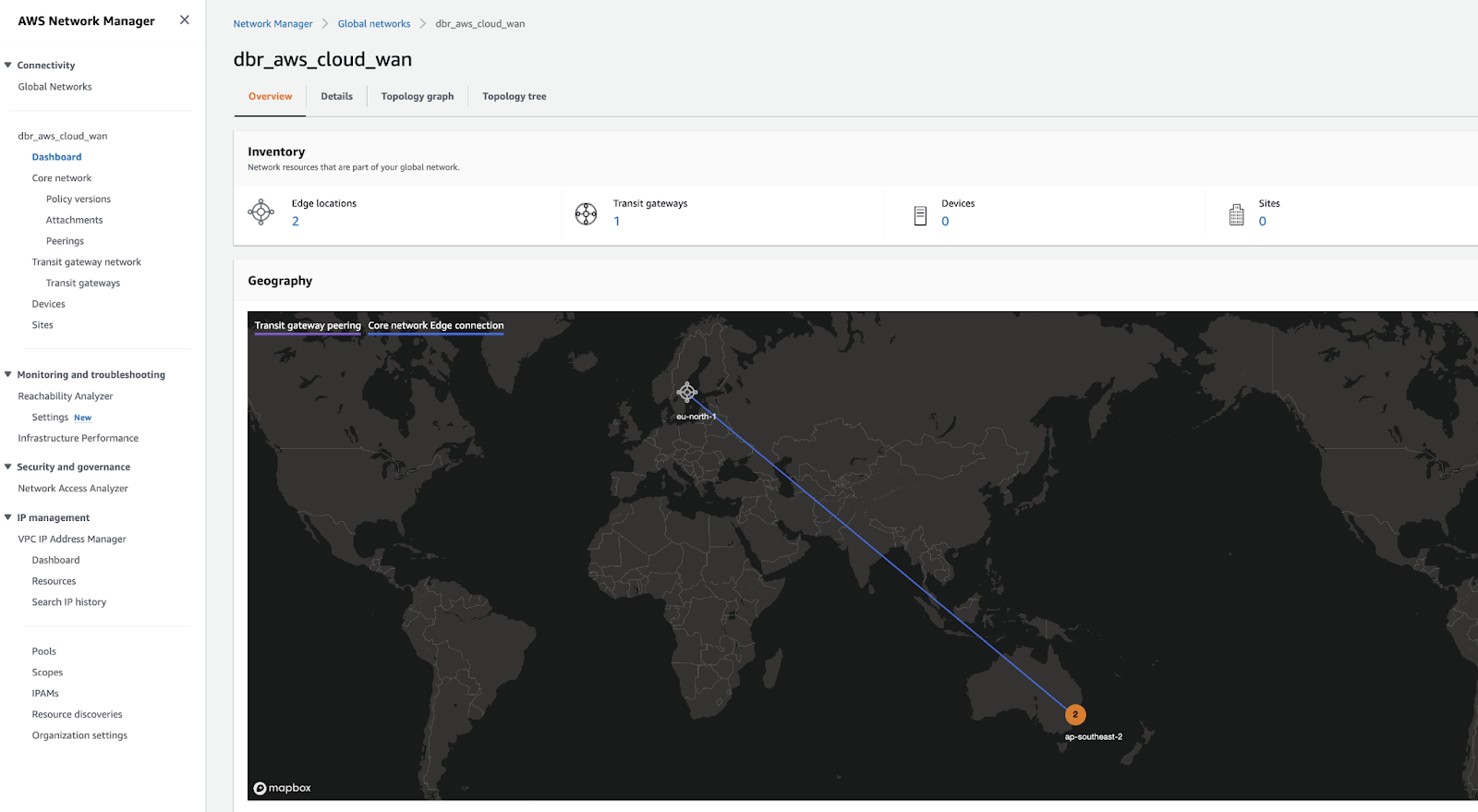 Cloud WAN allows mapping of VPCs to segments and the regional connection point for your