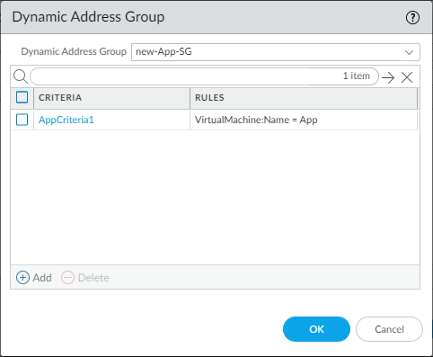 9. On the Dynamic Address Group window, click OK to finish or Add to create additional criteria (up to five total) and rules.