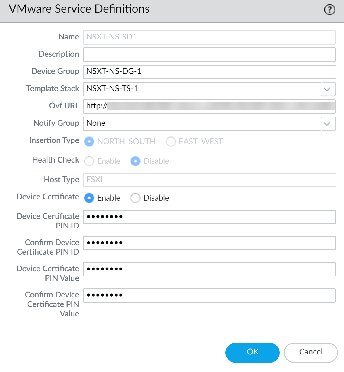 A service definition specifies the configuration for the VM-Series firewalls installed in your NSX-T data center environment. The service definition must include the device group, a template stack, and an OVF URL.