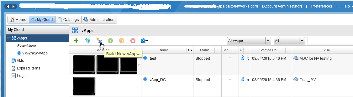 3. Select My CloudvApps and click the Name of the vApp in which to include the VM-Series firewall.