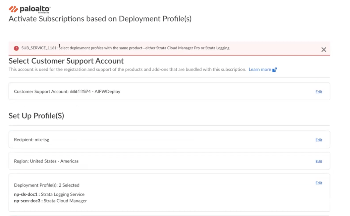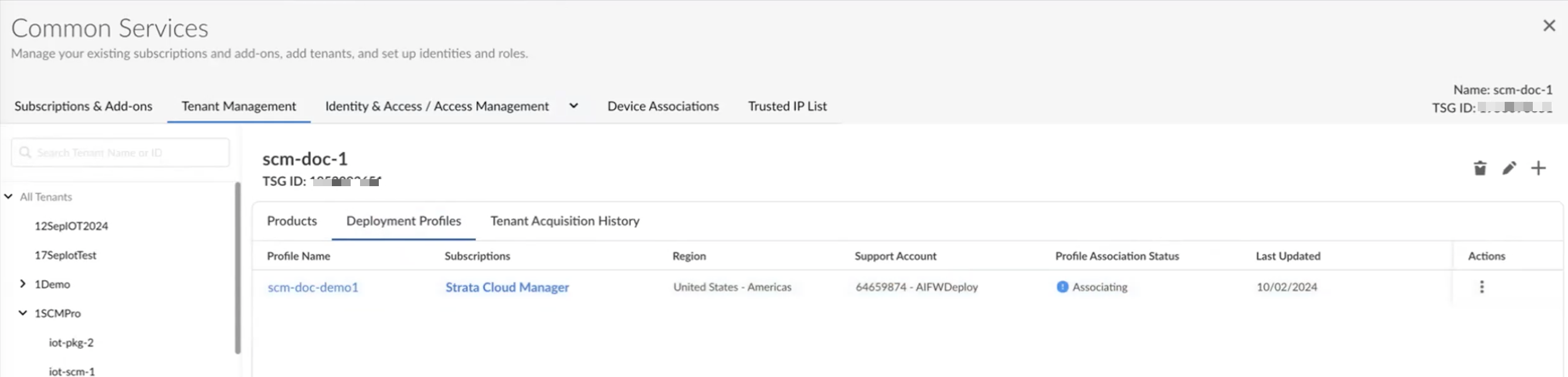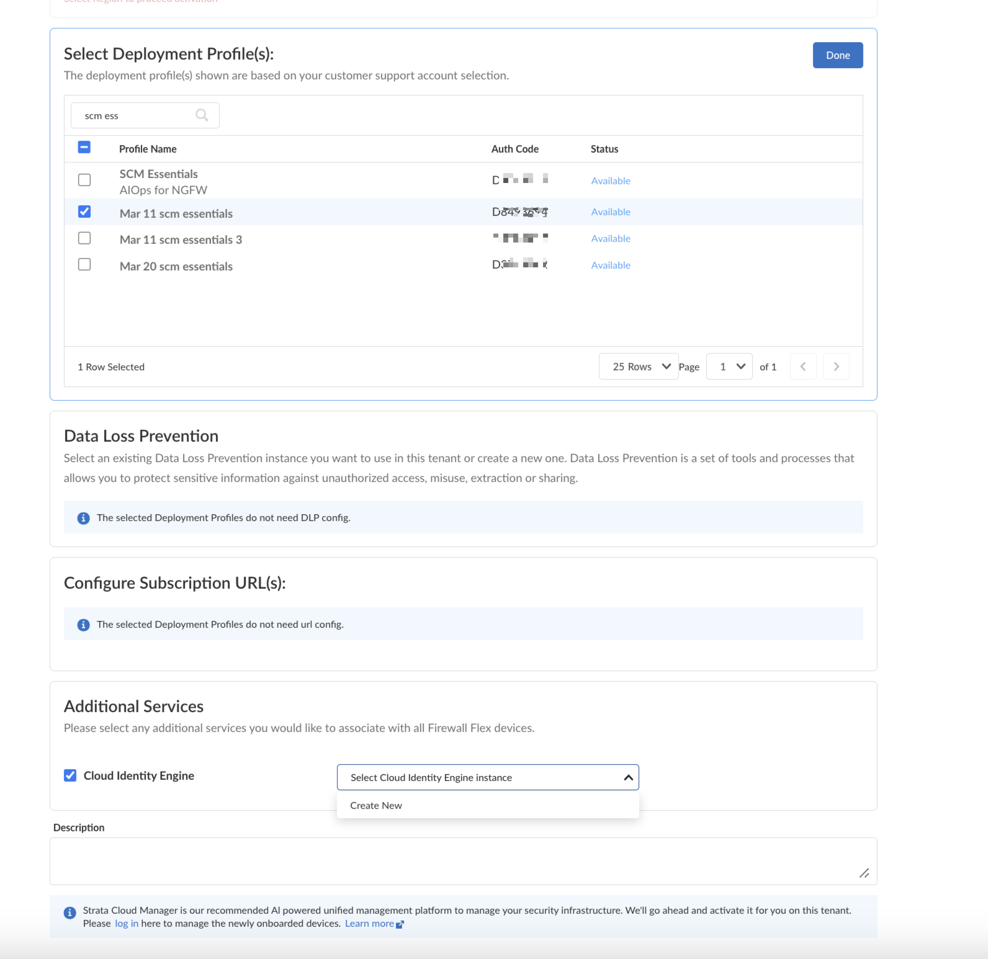 You will be prompted with authentication to SSO after which you will view the Activate Subscriptions based on the deployment profiles page.Login to the HUB with your SSO.Click Subscriptions and Add-ons and click the tenant in which your deployment profile is created. You will view the Activate Subscriptions based on Deployment Profiles page.Select the Customer Support Portal account that you are subscribed to.Select or Create the required tenant and the region it belongs to.Select the deployment profile that you wish to associate with the selected tenant. You can also search for the deployment profile using its name or auth code.If you have not subscribed to any of the cloud services, you will still be able to view the deployment profile in this section.The status of the deployment profiles is listed as Available or Not available and the required dependency to make the deployment profile available is also listed. The Deployment Profiles listed as available can be associated with the tenant.The deployment profiles listed as Not available might have a missing or a conflicting service under the selected tenant. For example, if you have a deployment profile with Strata Cloud Manager Pro subscription that is associated with a TSG, and another deployment profile with AIOps subscription, the deployment profiles will be listed as available. However, you won't be able to activate the deployment profile with AIOps under the same TSG, and this will result in an error due to conflicting services. If you have a deployment profile with Strata Cloud Manager Pro, then you must not associate some profiles with Strata Cloud Manager Pro, some with Strata Logging Service and some with no subscription. Ensure that you associate all the profiles with Strata Cloud Manager Pro.(optional) Select the Additional Services that you would like all your flex firewall devices to be associated with. You can either select the required Cloud Identity Engine service or create a new one.