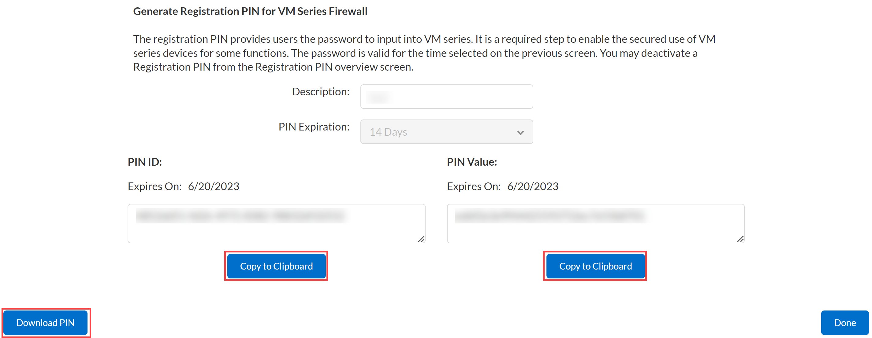 The auto registration PIN is valid only for the specified time period. For fully automated environments, such as auto scaling VM-Series deployments, the auto registration PIN should be regenerated before the expiration date and the new PIN ID and Value updated in the bootstrap parameters.